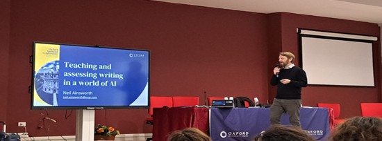 Il relatore ha riflettuto sul ruolo del docente oggi, su come guidare gli studenti nell’uso consapevole degli strumenti digitali e su come valutare la produzione scritta in modo efficace. E’ riuscito anche a rimuovere la convinzione tra il pubblico che l’IA avrebbe ucciso la scrittura, dimostrando come, invece, possa svilupparne la capacità di esprimere al meglio la nostra umanità in modo creativo, divertente, aprendo la mente degli studenti ad altri punti di vista .
