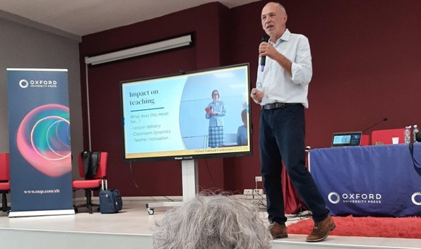 A seguire il primo intervento, “Teaching and Assessing Writing in a World of AI”, ha trattato l’evoluzione delle competenze di scrittura in un contesto in cui l’intelligenza artificiale suscita ancora tanto scetticismo tra i docenti. Con semplicità, ma in modo molto convincente, il relatore ha illustrato come l’IA possa essere un prezioso alleato nelle pratiche didattiche per migliorare la produzione di saggi, articoli, recensioni e Email nel motivare gli studenti a scrivere, nello sviluppare idee (fase della bozza iniziale), ampliare il lessico (fase dell’articolazione delle idee), nell’ adattare allo specifico destinatario e all’impatto/scopo desiderato e/o richiesto (fase della influenza – registro e impatto generale sul lettore) , nello sviluppare consapevolezza dei propri errori ed avviare alla autocorrezione (fase di revisione dell’elaborato).